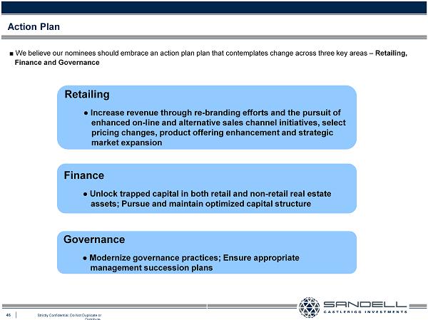 46 Strictly Confidential. Do Not Duplicate or Distribute. Ŷ We believe our nominees should embrace an action plan plan that contemplates change across three key areas – Retailing, Finance and Governance Action Plan Retailing Ɣ Increase revenue through re - branding efforts and the pursuit of enhanced on - line and alternative sales channel initiatives, select pricing changes, product offering enhancement and strategic market expansion Finance Ɣ Unlock trapped capital in both retail and non - retail real estate assets; Pursue and maintain optimized capital structure Governance Ɣ Modernize governance practices; Ensure appropriate management succession plans 1