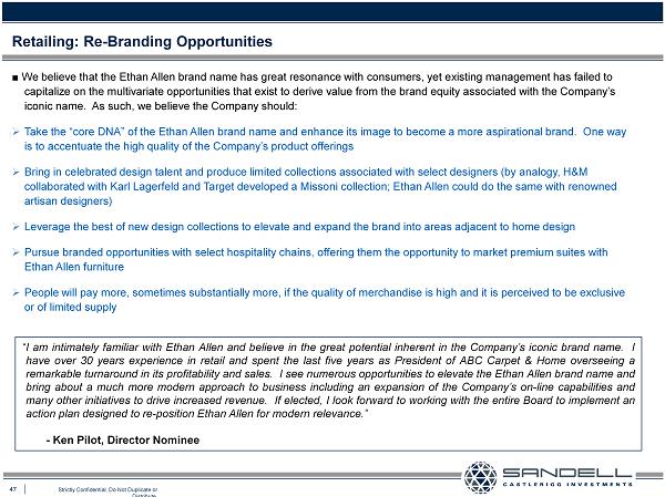 47 Strictly Confidential. Do Not Duplicate or Distribute. Ŷ We believe that the Ethan Allen brand name has great resonance with consumers, yet existing management has failed to capitalize on the multivariate opportunities that exist to derive value from the brand equity associated with the Company’s iconic name. As such, we believe the Company should: » Take the “core DNA” of the Ethan Allen brand name and enhance its image to become a more aspirational brand. One way is to accentuate the high quality of the Company’s product offerings » Bring in celebrated design talent and produce limited collections associated with select designers (by analogy, H&M collaborated with Karl Lagerfeld and Target developed a Missoni collection; Ethan Allen could do the same with renowned artisan designers) » Leverage the best of new design collections to elevate and expand the brand into areas adjacent to home design » Pursue branded opportunities with select hospitality chains, offering them the opportunity to market premium suites with Ethan Allen furniture » People will pay more, sometimes substantially more, if the quality of merchandise is high and it is perceived to be exclusive or of limited supply Retailing: Re - Branding Opportunities “I am intimately familiar with Ethan Allen and believe in the great potential inherent in the Company’s iconic brand name . I have over 30 years experience in retail and spent the last five years as President of ABC Carpet & Home overseeing a remarkable turnaround in its profitability and sales . I see numerous opportunities to elevate the Ethan Allen brand name and bring about a much more modern approach to business including an expansion of the Company’s on - line capabilities and many other initiatives to drive increased revenue . If elected, I look forward to working with the entire Board to implement an action plan designed to re - position Ethan Allen for modern relevance . ” - Ken Pilot, Director Nominee