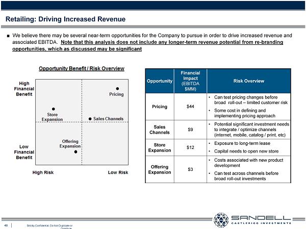 48 Strictly Confidential. Do Not Duplicate or Distribute. Ŷ We believe there may be several near - term opportunities for the Company to pursue in order to drive increased revenue and associated EBITDA. Note that this analysis does not include any longer - term revenue potential from re - branding opportunities, which as discussed may be significant Retailing: Driving Increased Revenue Opportunity Financial Impact (EBITDA $MM) Risk Overview Pricing $44 • Can test pricing changes before broad roll - out – limited customer risk • Some cost in defining and implementing pricing approach Sales Channels $9 • Potential significant investment needs to integrate / optimize channels (internet, mobile, catalog / print, etc ) Store Expansion $12 • Exposure to long - term lease • Capital needs to open new store Offering Expansion $3 • Costs associated with new product development • Can test across channels before broad roll - out investments