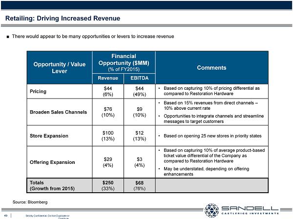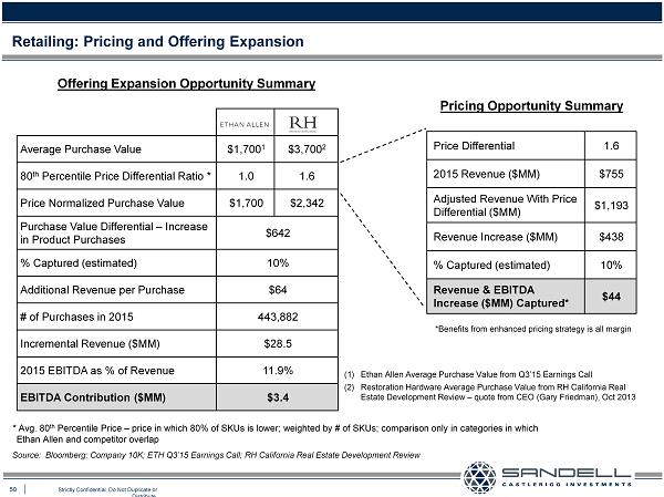 49 Strictly Confidential. Do Not Duplicate or Distribute. Ŷ There would appear to be many opportunities or levers to increase revenue Retailing: Driving Increased Revenue Opportunity / Value Lever Financial Opportunity ($MM) (% of FY2015 ) Comments Revenue EBITDA Pricing $44 (6%) $44 (49%) • Based on capturing 10% of pricing differential as compared to Restoration Hardware Broaden Sales Channels $76 (10%) $9 (10%) • Based on 15% revenues from direct channels – 10% above current rate • Opportunities to integrate channels and streamline messages to target customers Store Expansion $100 (13%) $12 (13%) • Based on opening 25 new stores in priority states Offering Expansion $29 (4%) $3 (4%) • Based on capturing 10% of average product - based ticket value differential of the Company as compared to Restoration Hardware • May be understated, depending on offering enhancements Totals (Growth from 2015) $250 (33%) $68 (76%) Source: Bloomberg