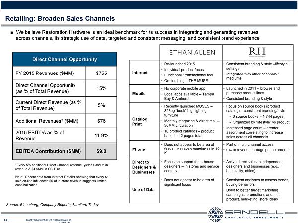 50 Strictly Confidential. Do Not Duplicate or Distribute. Retailing: Pricing and Offering Expansion Average Purchase Value $1,700 1 $3,700 2 80 th Percentile Price Differential Ratio * 1.0 1.6 Price Normalized Purchase Value $1,700 $2,342 Purchase Value Differential – Increase in Product Purchases $642 % Captured (estimated) 10% Additiona l Revenue per Purchase $64 # of Purchases in 2015 443,882 Incremental Revenue ($MM) $28.5 2015 EBITDA as % of Revenue 11.9% EBITDA Contribution ($MM) $3.4 Price Differential 1.6 2015 Revenue ($MM) $755 Adjusted Revenue With Price Differential ($MM) $1,193 Revenue Increase ($MM) $438 % Captured (estimated) 10% Revenue & EBITDA Increase ($MM) Captured* $44 *Benefits from enhanced pricing strategy is all margin (1) Ethan Allen Average Purchase Value from Q3’15 Earnings Call (2) Restoration Hardware Average Purchase Value from RH California Real Estate Development Review – quote from CEO (Gary Friedman), Oct 2013 Source: Bloomberg; Company 10K; ETH Q3’15 Earnings Call; RH California Real Estate Development Review Offering Expansion Opportunity Summary Pricing Opportunity Summary * Avg. 80 th Percentile Price – price in which 80% of SKUs is lower; weighted by # of SKUs; comparison only in categories in which Ethan Allen and competitor overlap