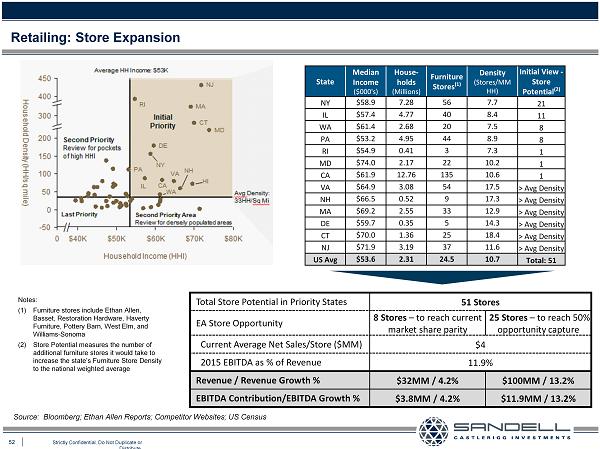 51 Strictly Confidential. Do Not Duplicate or Distribute. Retailing: Broaden Sales Channels Direct Channel Opportunity FY 2015 Revenues ($MM) $755 Direct Channel Opportunity (as % of Total Revenue) 15% Current Direct Revenue (as % of Total Revenue) 5% Additional Revenues* ($MM) $76 2015 EBITDA as % of Revenue 11.9% EBITDA Contribution ($MM) $9.0 *Every 5% additional Direct Channel revenue yields $38MM in revenue & $4.5MM in EBITDA Note: Recent data from Internet Retailer showing that every $1 sold on - line influences $6 of in - store revenue suggests limited cannibalization Internet • Re - launched 2015 • Individual product focus • Functional / transactional feel • On - line blog – THE MUSE • Consisten t branding & style – lifestyle settings • Integrated with other channels / mediums Mobile • No corporate mobile app • Local apps available – Tampa Bay & Amherst • Launched in 2011 – browse and purchase product lines • Consistent branding & style Catalog / Print • Recently launched MUSES – 328pg “book” highlighting furniture • Monthly magazine & direct mail – 30MM circulation • 10 product catalogs – product based, 412 pages total • Focus on source books (product catalog) – consistent branding/style - 6 source books - 1,744 pages - Organized by “lifestyle” vs product • Increased page count – greater assortment correlating to increase sales across all channels Phone • Does not appear to be area of focus – not even mentioned in 10 - K • Part of multi - channel access • 9% of revenue through phone orders Direct to Designers & Businesses • Focus on support for in - house designers – in stores and service centers • Active direct sales to independent designers and businesses (e.g., hospitality, office) Use of Data • Does not appear to be area of significant focus • Consistent analyses to assess trends, buying behaviors • Used to better target marketing campaigns, promotions and test product, marketing, store ideas Source: Bloomberg; Company Reports; Furniture Today Ŷ We believe Restoration Hardware is an ideal benchmark for its success in integrating and generating revenues across channels, its strategic use of data, targeted and consistent messaging, and consistent brand experience