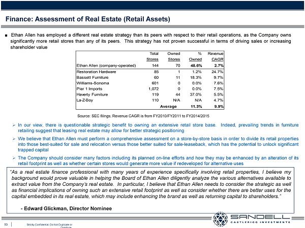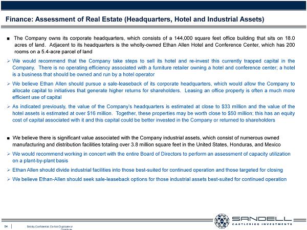 53 Strictly Confidential. Do Not Duplicate or Distribute. Ŷ Ethan Allen has employed a different real estate strategy than its peers with respect to their retail operations, as the Company owns significantly more retail stores than any of its peers . This strategy has not proven successful in terms of driving sales or increasing shareholder value Finance: Assessment of Real Estate (Retail Assets) Source: SEC filings; Revenue CAGR is from FY2010/FY2011 to FY2014/2015 » In our view, there is questionable strategic benefit to owning an extensive retail store base . Indeed, prevailing trends in furniture retailing suggest that leasing real estate may allow for better strategic positioning » We believe that Ethan Allen must perform a comprehensive assessment on a store - by - store basis in order to divide its retail properties into those best - suited for sale and relocation versus those better suited for sale - leaseback, which has the potential to unlock significant trapped capital » The Company should consider many factors including its planned on - line efforts and how they may be enhanced by an alteration of its retail footprint as well as whether certain stores would generate more value if redeveloped for alternative uses “As a real estate finance professional with many years of experience specifically involving retail properties, I believe my background would prove valuable in helping the Board of Ethan Allen diligently analyze the various alternatives available to extract value from the Company’s real estate . In particular, I believe that Ethan Allen needs to consider the strategic as well as financial implications of owning such an extensive retail footprint as well as consider whether there are better uses for the capital embedded in its real estate, which may include enhancing the brand as well as returning capital to shareholders . ” - Edward Glickman, Director Nominee Total Owned % Revenue Stores Stores Owned CAGR Ethan Allen (company-operated) 144 70 48.6% 2.7% Restoration Hardware 85 1 1.2% 24.7% Bassett Furniture 60 11 18.3% 9.7% Williams-Sonoma 601 0 0.0% 7.6% Pier 1 Imports 1,072 0 0.0% 7.5% Haverty Furniture 119 44 37.0% 5.5% La-Z-Boy 110 N/A N/A 4.7% Average 11.3% 9.9%