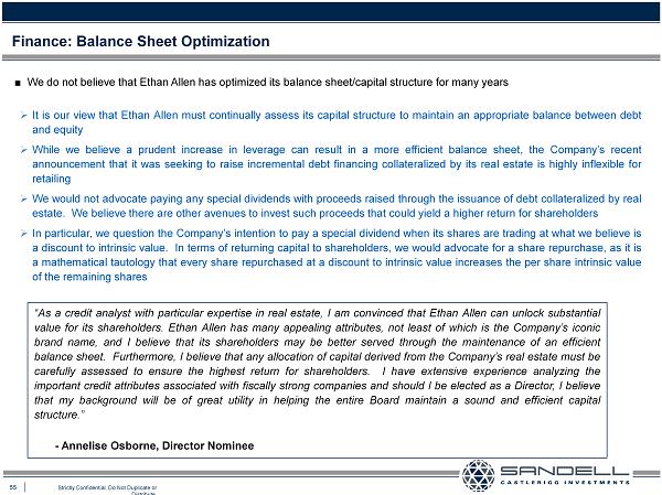 55 Strictly Confidential. Do Not Duplicate or Distribute. Ŷ We do not believe that Ethan Allen has optimized its balance sheet/capital structure for many years Finance: Balance Sheet Optimization » It is our view that Ethan Allen must continually assess its capital structure to maintain an appropriate balance between debt and equity » While we believe a prudent increase in leverage can result in a more efficient balance sheet, the Company’s recent announcement that it was seeking to raise incremental debt financing collateralized by its real estate is highly inflexible for retailing » We would not advocate paying any special dividends with proceeds raised through the issuance of debt collateralized by real estate . We believe there are other avenues to invest such proceeds that could yield a higher return for shareholders » In particular, we question the Company’s intention to pay a special dividend when its shares are trading at what we believe is a discount to intrinsic value . In terms of returning capital to shareholders, we would advocate for a share repurchase, as it is a mathematical tautology that every share repurchased at a discount to intrinsic value increases the per share intrinsic value of the remaining shares “As a credit analyst with particular expertise in real estate, I am convinced that Ethan Allen can unlock substantial value for its shareholders . Ethan Allen has many appealing attributes, not least of which is the Company’s iconic brand name, and I believe that its shareholders may be better served through the maintenance of an efficient balance sheet . Furthermore, I believe that any allocation of capital derived from the Company’s real estate must be carefully assessed to ensure the highest return for shareholders . I have extensive experience analyzing the important credit attributes associated with fiscally strong companies and should I be elected as a Director, I believe that my background will be of great utility in helping the entire Board maintain a sound and efficient capital structure . ” - Annelise Osborne, Director Nominee