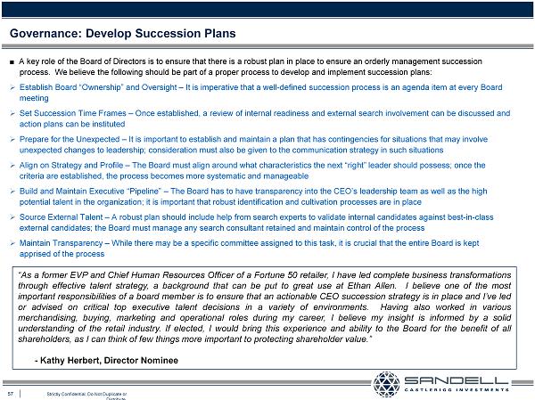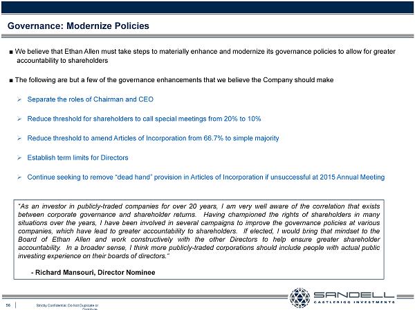 56 Strictly Confidential. Do Not Duplicate or Distribute. Ŷ We believe that Ethan Allen must take steps to materially enhance and modernize its governance policies to allow for greater accountability to shareholders Ŷ The following are but a few of the governance enhancements that we believe the Company should make » Separate the roles of Chairman and CEO » Reduce threshold for shareholders to call special meetings from 20% to 10% » Reduce threshold to amend Articles of Incorporation from 66.7% to simple majority » Establish term limits for Directors » Continue seeking to remove “dead hand” provision in Articles of Incorporation if unsuccessful at 2015 Annual Meeting Governance: Modernize Policies “As an investor in publicly - traded companies for over 20 years, I am very well aware of the correlation that exists between corporate governance and shareholder returns . Having championed the rights of shareholders in many situations over the years, I have been involved in several campaigns to improve the governance policies at various companies, which have lead to greater accountability to shareholders . If elected, I would bring that mindset to the Board of Ethan Allen and work constructively with the other Directors to help ensure greater shareholder accountability . In a broader sense, I think more publicly - traded corporations should include people with actual public investing experience on their boards of directors . “ - Richard Mansouri, Director Nominee