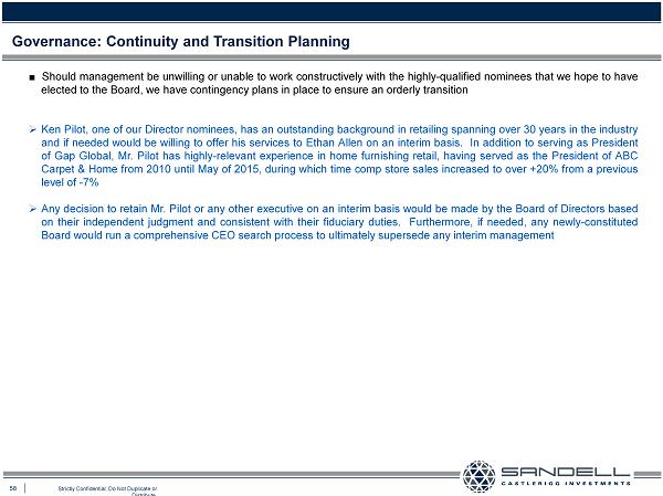 58 Strictly Confidential. Do Not Duplicate or Distribute. Governance: Continuity and Transition Planning Ŷ Should management be unwilling or unable to work constructively with the highly - qualified nominees that we hope to have elected to the Board, we have contingency plans in place to ensure an orderly transition » Ken Pilot, one of our Director nominees, has an outstanding background in retailing spanning over 30 years in the industry and if needed would be willing to offer his services to Ethan Allen on an interim basis . In addition to serving as President of Gap Global, Mr . Pilot has highly - relevant experience in home furnishing retail, having served as the President of ABC Carpet & Home from 2010 until May of 2015 , during which time comp store sales increased to over + 20 % from a previous level of - 7 % » Any decision to retain Mr . Pilot or any other executive on an interim basis would be made by the Board of Directors based on their independent judgment and consistent with their fiduciary duties . Furthermore, if needed, any newly - constituted B oard would run a comprehensive CEO search process to ultimately supersede any interim management