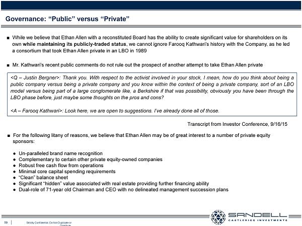 59 Strictly Confidential. Do Not Duplicate or Distribute. Ŷ While we believe that Ethan Allen with a reconstituted Board has the ability to create significant value for shareholders on i ts own while maintaining its publicly - traded status , we cannot ignore Farooq Kathwari’s history with the Company, as he led a consortium that took Ethan Allen private in an LBO in 1989 Ŷ Mr. Kathwari’s recent public comments do not rule out the prospect of another attempt to take Ethan Allen private Governance: “Public” versus “Private” < Q – Justin Bergner> : Thank you . With respect to the activist involved in your stock, I mean, how do you think about being a public company versus being a private company and you know within the context of being a private company, sort of an LBO model versus being part of a large conglomerate like, a Berkshire if that was possibility, obviously you have been through the LBO phase before, just maybe some thoughts on the pros and cons? <A – Farooq Kathwari> : Look here, we are open to suggestions . I’ve already done all of those . Ŷ For the following litany of reasons, we believe that Ethan Allen may be of great interest to a number of private equity sponsors : Ɣ Un - paralleled brand name recognition Ɣ Complementary to certain other private equity - owned companies Ɣ Robust free cash flow from operations Ɣ Minimal core capital spending requirements Ɣ “ Clean” balance sheet Ɣ Significant “hidden” value associated with real estate providing further financing ability Ɣ Dual - role of 71 - year old Chairman and CEO with no delineated management succession plans Transcript from Investor Conference, 9/16/15