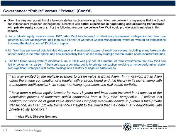 60 Strictly Confidential. Do Not Duplicate or Distribute. Governance: “Public” versus “Private” (Cont’d) Ŷ Given the very real possibility of a take - private transaction involving Ethan Allen, we believe it is imperative that the Boar d has independent (read non - management) Directors with actual experience in negotiating and executing transactions with private equity sponsors. For the following reasons, we believe Alex Wolf would provide significant value in this capacity » As a private equity investor since 1997 , Alex Wolf has focused on identifying businesses underperforming their true potential at Ares Management and then as a Partner at Cerberus Capital Management, where he worked on transactions involving the deployment of $ 3 billion of capital » Mr . Wolf has performed detailed due diligence and evaluated dozens of retail businesses, including many take - private opportunities in the retail space, and has successfully led or co - led many strategic overhauls and operational turnarounds » The $ 17 billion take - private of Albertson’s Inc . in 2006 was just one of a number of retail investments that Alex Wolf has led or co - led in his career . Albertson’s was a complex public - to - private transaction involving an underperforming retailer with significant untapped real estate holdings and a history of negative sales trends “I am truly excited by the multiple avenues to create value at Ethan Allen . In my opinion, Ethan Allen offers the unique combination of a retailer with a strong brand and rich history in its niche, along with tremendous inefficiencies in its sales, marketing, operations and real estate portfolio . “I have been a private equity investor for over 18 years and have been involved in all aspects of the acquisition process of numerous public companies from a “buy side” perspective . I believe this background would be of great value should the Company eventually decide to pursue a take - private transaction, as I can provide tremendous insight to the Board that may help in any negotiations with private equity sponsors . ” - Alex Wolf, Director Nominee