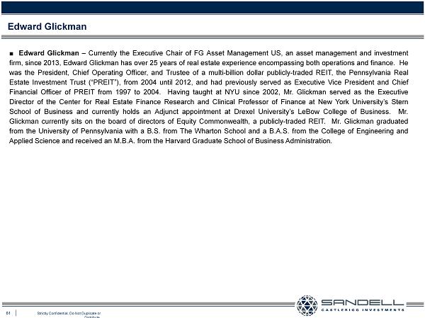61 Strictly Confidential. Do Not Duplicate or Distribute. ■ Edward Glickman – Currently the Executive Chair of FG Asset Management US, an asset management and investment firm, since 2013 , Edward Glickman has over 25 years of real estate experience encompassing both operations and finance . He was the President, Chief Operating Officer, and Trustee of a multi - billion dollar publicly - traded REIT, the Pennsylvania Real Estate Investment Trust (“PREIT”), from 2004 until 2012 , and had previously served as Executive Vice President and Chief Financial Officer of PREIT from 1997 to 2004 . Having taught at NYU since 2002 , Mr . Glickman served as the Executive Director of the Center for Real Estate Finance Research and Clinical Professor of Finance at New York University’s Stern School of Business and currently holds an Adjunct appointment at Drexel University’s LeBow College of Business . Mr . Glickman currently sits on the board of directors of Equity Commonwealth, a publicly - traded REIT . Mr . Glickman graduated from the University of Pennsylvania with a B . S . from The Wharton School and a B . A . S . from the College of Engineering and Applied Science and received an M . B . A . from the Harvard Graduate School of Business Administration . Edward Glickman