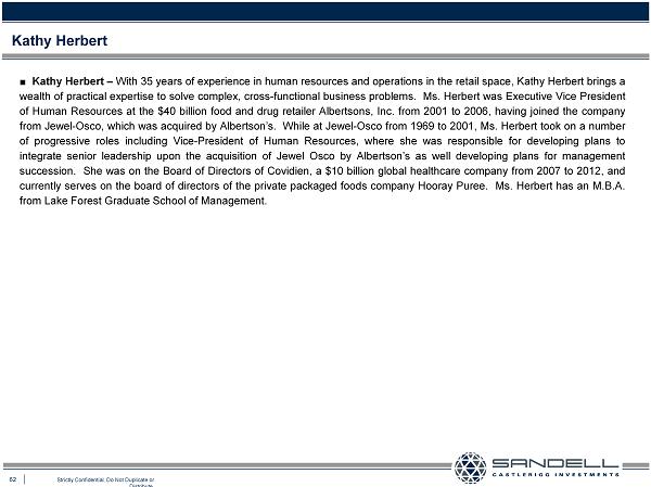 62 Strictly Confidential. Do Not Duplicate or Distribute. ■ Kathy Herbert – With 35 years of experience in human resources and operations in the retail space, Kathy Herbert brings a wealth of practical expertise to solve complex, cross - functional business problems . Ms . Herbert was Executive Vice President of Human Resources at the $ 40 billion food and drug retailer Albertsons, Inc . from 2001 to 2006 , having joined the company from Jewel - Osco, which was acquired by Albertson’s . While at Jewel - Osco from 1969 to 2001 , Ms . Herbert took on a number of progressive roles including Vice - President of Human Resources, where she was responsible for developing plans to integrate senior leadership upon the acquisition of Jewel Osco by Albertson’s as well developing plans for management succession . She was on the Board of Directors of Covidien, a $ 10 billion global healthcare company from 2007 to 2012 , and currently serves on the board of directors of the private packaged foods company Hooray Puree . Ms . Herbert has an M . B . A . from Lake Forest Graduate School of Management . Kathy Herbert
