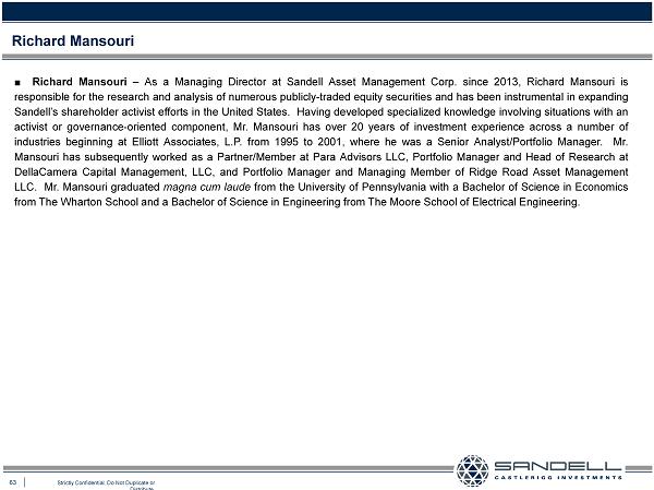 63 Strictly Confidential. Do Not Duplicate or Distribute. ■ Richard Mansouri – As a Managing Director at Sandell Asset Management Corp . since 2013 , Richard Mansouri is responsible for the research and analysis of numerous publicly - traded equity securities and has been instrumental in expanding Sandell’s shareholder activist efforts in the United States . Having developed specialized knowledge involving situations with an activist or governance - oriented component, Mr . Mansouri has over 20 years of investment experience across a number of industries beginning at Elliott Associates, L . P . from 1995 to 2001 , where he was a Senior Analyst/Portfolio Manager . Mr . Mansouri has subsequently worked as a Partner/Member at Para Advisors LLC, Portfolio Manager and Head of Research at DellaCamera Capital Management, LLC, and Portfolio Manager and Managing Member of Ridge Road Asset Management LLC . Mr . Mansouri graduated magna cum laude from the University of Pennsylvania with a Bachelor of Science in Economics from The Wharton School and a Bachelor of Science in Engineering from The Moore School of Electrical Engineering . Richard Mansouri