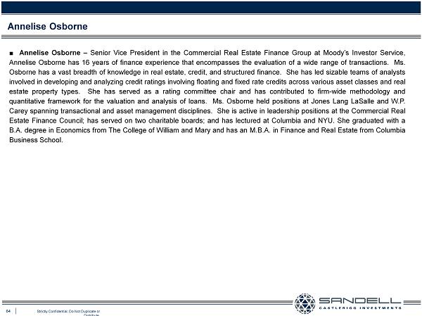 64 Strictly Confidential. Do Not Duplicate or Distribute. ■ Annelise Osborne – Senior Vice President in the Commercial Real Estate Finance Group at Moody’s Investor Service, Annelise Osborne has 16 years of finance experience that encompasses the evaluation of a wide range of transactions . Ms . Osborne has a vast breadth of knowledge in real estate, credit, and structured finance . She has led sizable teams of analysts involved in developing and analyzing credit ratings involving floating and fixed rate credits across various asset classes and real estate property types . She has served as a rating committee chair and has contributed to firm - wide methodology and quantitative framework for the valuation and analysis of loans . Ms . Osborne held positions at Jones Lang LaSalle and W . P . Carey spanning transactional and asset management disciplines . She is active in leadership positions at the Commercial Real Estate Finance Council ; has served on two charitable boards ; and has lectured at Columbia and NYU . She graduated with a B . A . degree in Economics from The College of William and Mary and has an M . B . A . in Finance and Real Estate from Columbia Business School . Annelise Osborne