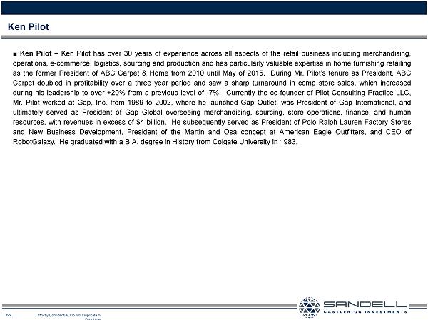 65 Strictly Confidential. Do Not Duplicate or Distribute. ■ Ken Pilot – Ken Pilot has over 30 years of experience across all aspects of the retail business including merchandising, operations, e - commerce, logistics, sourcing and production and has particularly valuable expertise in home furnishing retailing as the former President of ABC Carpet & Home from 2010 until May of 2015 . During Mr . Pilot’s tenure as President, ABC Carpet doubled in profitability over a three year period and saw a sharp turnaround in comp store sales, which increased during his leadership to over + 20 % from a previous level of - 7 % . Currently the co - founder of Pilot Consulting Practice LLC, Mr . Pilot worked at Gap, Inc . from 1989 to 2002 , where he launched Gap Outlet, was President of Gap International, and ultimately served as President of Gap Global overseeing merchandising, sourcing, store operations, finance, and human resources, with revenues in excess of $ 4 billion . He subsequently served as President of Polo Ralph Lauren Factory Stores and New Business Development, President of the Martin and Osa concept at American Eagle Outfitters, and CEO of RobotGalaxy . He graduated with a B . A . degree in History from Colgate University in 1983 . Ken Pilot