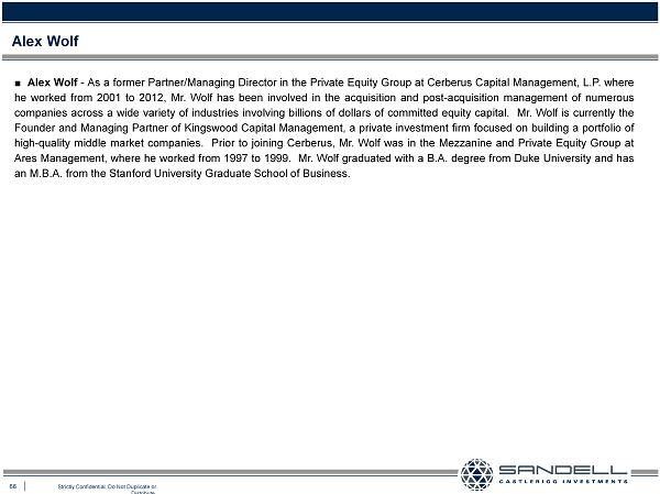 66 Strictly Confidential. Do Not Duplicate or Distribute. ■ Alex Wolf - As a former Partner/Managing Director in the Private Equity Group at Cerberus Capital Management, L . P . where he worked from 2001 to 2012 , Mr . Wolf has been involved in the acquisition and post - acquisition management of numerous companies across a wide variety of industries involving billions of dollars of committed equity capital . Mr . Wolf is currently the Founder and Managing Partner of Kingswood Capital Management, a private investment firm focused on building a portfolio of high - quality middle market companies . Prior to joining Cerberus, Mr . Wolf was in the Mezzanine and Private Equity Group at Ares Management, where he worked from 1997 to 1999 . Mr . Wolf graduated with a B . A . degree from Duke University and has an M . B . A . from the Stanford University Graduate School of Business . Alex Wolf